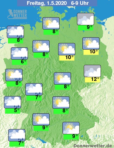 Der Maifeiertag startet vor allem an Rhein und Oder mit einer meist geschlossenen Wolkendecke, vor allem in der Westhälfte Deutschlands fällt daraus auch immer wieder Regen. In den übrigen Landesteilen zeigt sich der Himmel mal heiter, mal ist es locker bewölkt und es bleibt meist trocken.