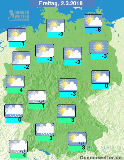 Die Tageshöchstwerte bewegen sich in der Nordhälfte noch häufig im Frostbereich und erreichen um -6 Grad C an der Ostseeküste und um -1 Grad C in Ostfriesland. Im Süden und Südwesten klettern die Temperaturen vielerorts bereits in den Plusbereich und erreichen um 1 bis 4 Grad C.