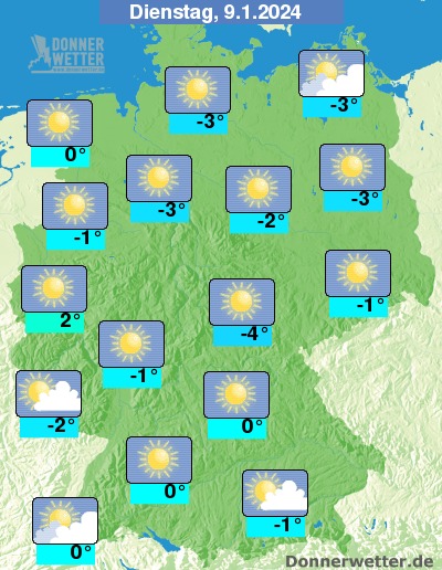 Die Temperaturen erreichen im Tagesverlauf Höchstwerte um -4 Grad in Erfurt, 0 Grad am Oberrhein und um 2 Grad in der Kölner Bucht.