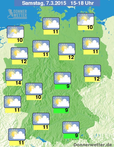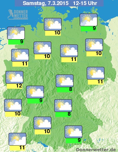 Bis zum Nachmittag steigen die Höchstwerte dann auf Temperaturen um 9 Grad C im Thüringer Wald und bis 14 Grad C im Rheinland.