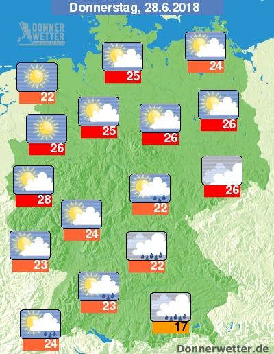 In der Nordwesthälfte scheint für längere Zeit die Sonne. Zwar ziehen zum Nachmittag von Osten Wolkenfelder vorüber, doch sollten diese in der Regel harmlos bleiben. In der Südosthälfte hingegen dominieren die Wolken und von Österreich und Tschechien her setzt kräftiger Regen ein, der große Teile von Bayern und Baden-Württemberg erfasst. Sonst können sich einzelne Schauer und Gewitter entwickeln. Die Höchsttemperaturen liegen allgemein zwischen 22 bis 29 Grad, dort wo es regnet bleibt es kühler. Der Nord- bis Nordostwind kann gebietsweise böig auffrischen.