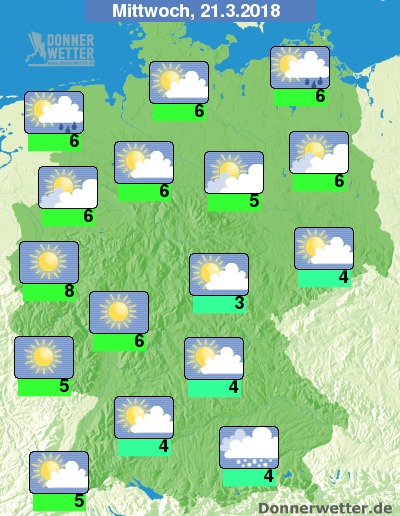 An den Alpen fällt noch etwas Schnee. Sonst scheint für längere Zeit die Sonne. Im Norden ziehen im Tagesverlauf dichtere Wolken auf und sorgen örtlich für etwas Regen oder einzelne Schauer. Nach verbreitet frostiger Nacht klettern die Temperaturen bis zum Nachmittag auf 3 bis 8 Grad. Etwas kälter bleibt es in Teilen von Süddeutschland und an den Alpen. Der Wind weht dabei zunächst meist nur schwach. Im Tagesverlauf frischt im Norden der Südwestwind auf. In der Nacht auf Donnerstag bleibt es im Nordwesten meistens frostfrei. Sonst sinken die Werte wieder auf -9 bis -1 Grad. In Alpentälern wird es über einer Schneedecke und unter klarem Sternenhimmel noch kälter.