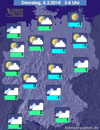 In der Nacht zum Dienstag zieht es sich im Süden zu, dabei ist im äußersten Süden hier und da etwas Regen oder Schnee möglich. Weiter nach Norden hin zeigt sich der Himmel meist nur gering bis wechselnd bewölkt, vor allem über dem Nordseeumfeld und über Sachsen mehrheitlich dicht bewölkt, dazu bleibt es aber trocken. Die Temperatur sinkt auf 4 Grad in Freiburg und bis -2 Grad im Eichsfeld.