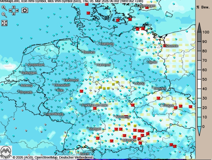Die Temperatur- und Wetterkarte für Donnerstagfrüh (06:00 Uhr) nach ICON: