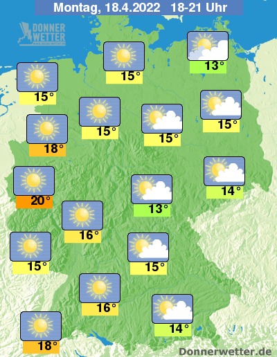 Heute Abend ist es über der Westhälfte des Landes weiterhin meist sonnig. Über der Osthälfte ist es überwiegend heiter und es ziehen einige, jedoch größtenteils lockere Wolkenfelder durch, dabei bleibt es trocken. Die Temperatur liegt bei 13 Grad in Erfurt und bis 20 Grad in Köln.