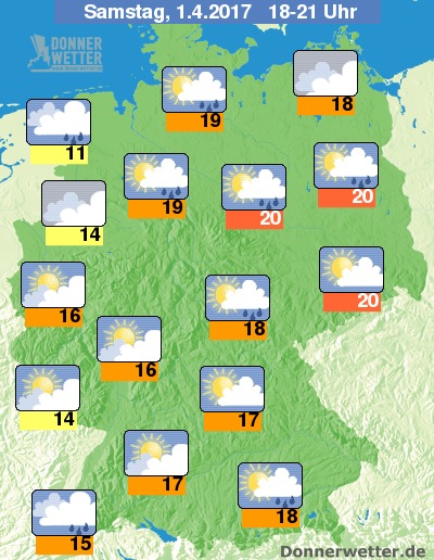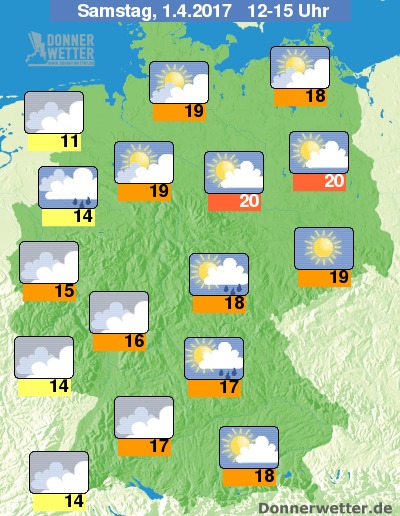 Heute Nachmittag ziehen über die westlichen Landesteile meist dichte Wolken hinweg, aber auch sonst ziehen zunehmend mehr und auch teils dichte Wolken durch, dabei muss mit einzelnen Schauern gerechnet werden. Örtlich sind sogar Gewitter möglich. Über der Osthälfte und besonders nach Osten hin scheint jedoch auch noch häufig die Sonne. Die Temperatur steigt auf nur noch 11 Grad in Emden und bis etwa 20 Grad in Magdeburg.