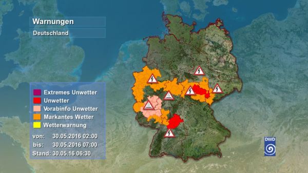 Aktuell bestehen Warnungen für die Mitte und den Westen. Auch Thüringen ist von Gewittern betroffen. Mehr im Nowcasting.