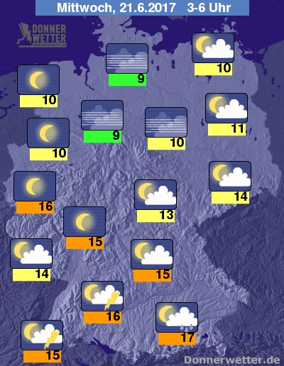 In der kommenden Nacht bilden sich im Alpenvorland weiterhin gebietsweise Schauer und einzelne Gewitter, diese klingen erst im Laufe der zweiten Nachthälfte nach und nach ab. Im übrigen Land ist der Himmel sternenklar oder nur locker bewölkt, dazu bleibt es trocken. Die Temperatur sinkt auf 17 Grad in München und bis 9 Grad in der Norddeutschen Tiefebene.