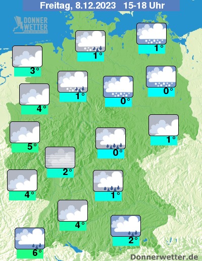 Heute Nachmittag kommen die Niederschläge bei meist starker Bewölkung oder bedecktem Himmel ostwärts voran. Teils fallen sie dabei als Regen, vor allem im Nordosten auch als Schnee; vorwiegend in den Mittelgebirgen ist auch gefrierender Regen möglich, es besteht erhöhte Glättegefahr! Im Süden weht ein meist schwacher, sonst mäßiger Wind.