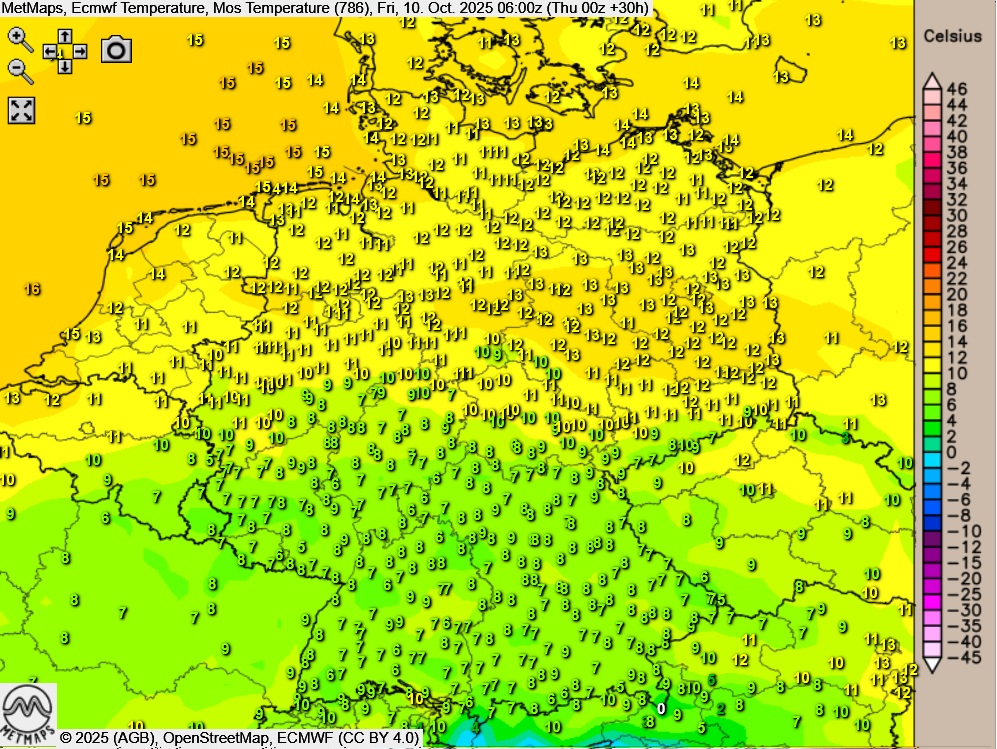 Die Lufttemperaturen sowie die Wetterkarte für Freitagmorgen (06:00 Uhr) nach ECMWF: