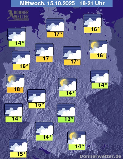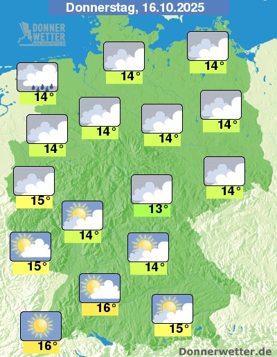 Am Donnerstag bleibt es über weiten Landesteilen meist stark bewölkt, hier und da sind kurze Auflockerungen möglich. Im Süden kann sich die Sonne allerdings häufiger durchsetzen, hier bleibt es komplett trocken. Im übrigen Bundesgebiet ist vereinzelt etwas Regen möglich. Die Höchstwerte liegen bei 13 Grad im Vogtland und bis 16 Grad im Breisgau.