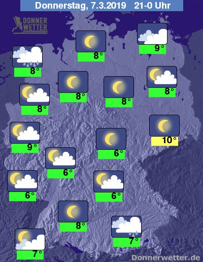 Bis Mitternacht klart der Himmel dann verbreitet auf, nur in Ostfriesland, sowie im südöstlichen Bayern halten sich noch einige Regenwolken.