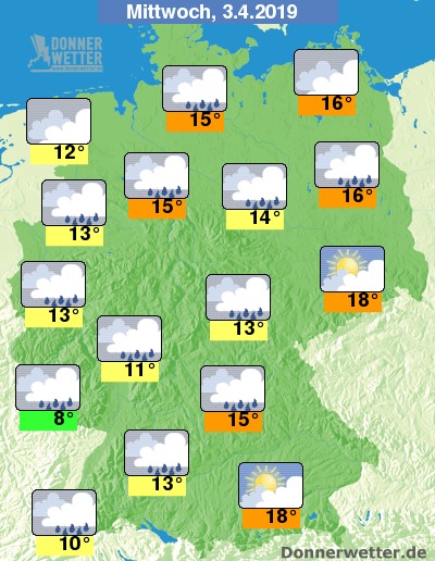 Die Höchsttemperaturen liegen dabei meistens zwischen 8 und 15 Grad, wobei es in Eifel und Hunsrück am kühlsten bleibt. Ganz im Osten, sowie im südöstlichen Bayern können nochmals Werte zwischen 15 und nahe 20 Grad erreicht werden.
