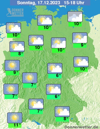 Am Nachmittag zeigt sich der Himmel über der Nord- und Nordosthälfte wechselnd oder stark bewölkt oder es ist bedeckt; Niederschläge sind aber nur selten zu erwarten. Sonst ist es teils heiter bis wolkig, im höheren Begland scheint die Sonne auch von einem wolkenlosen Himmel, teils hält sich Nebel.
