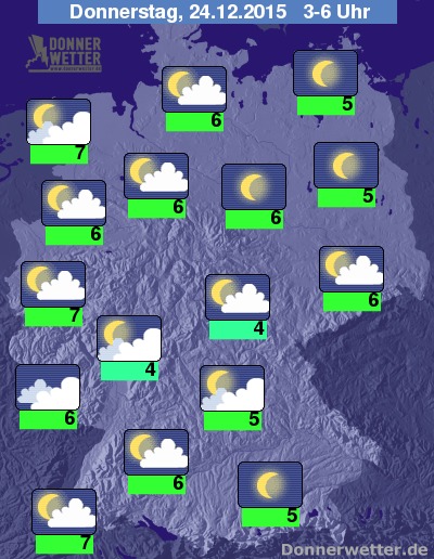 In der kommenden Nacht klart der Himmel besonders über dem Süden und im Nordosten Deutschlands verbreitet auf, in den anderen Landesteilen zieht meist nur lockere Bewölkung durch, gebietsweise halten sich auch mal dichtere Wolken, dabei bleibt es aber trocken. Die Temperatur sinkt auf 7 Grad in Freiburg und bis 4 Grad im Eichsfeld. An der Nordsee weht starker und zum Morgen hin zunehmend auch stürmischer Wind.