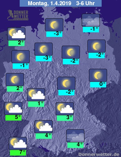 In der Nacht zum Montag zieht über der Südhälfte des Landes hier und da noch aufgelockerte Bewölkung durch, sonst ist es jedoch verbreitet nur gering bewölkt oder sogar sternenklar. Es bleibt trocken bei Tiefstwerten zwischen 7 Grad in Freiburg und etwa -3 Grad in der Lüneburger Heide.