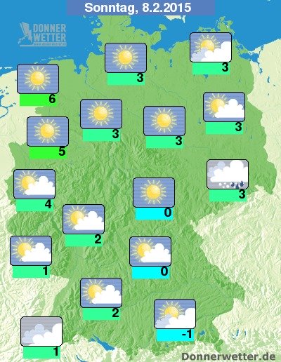 Heute ist es in weiten Teilen von Deutschland heiter bis sonnig und dazu trocken. Besonders von der Mitte bis in den Norden und in den Nordwesten ist ein häufig wolkenloser Himmel zu sehen. Teils dichte Wolken halten sich dagegen einerseits am Alpenrand, aber auch in den östlichsten Landesteilen, dazu ist hin und wieder etwas Schnee oder Schneeregen möglich, zumeist bleibt es aber trocken. Die Temperatur steigt auf -1 Grad am Alpenrand und bis 6 Grad an der Ems.