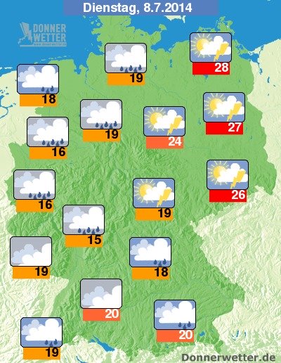 Am morgigen Dienstag kann sich bei meist dichter Bewölkung meist nur selten die Sonne zeigen. Vor allem nach Norden und Osten bilden sich oft Schauer und Gewitter. Nach Westen und Süden ist es meist sehr regnerisch und mit 15 bis 20 Grad deutlich kühler als im Nordosten, hier werden nämlich schwülwarme 24 bis 28 Grad erreicht. Es können in der Südhälfte im Laufe des Tages unwetterartige Regenmengen zusammen kommen, so dass Überschwemmungen möglich sind!