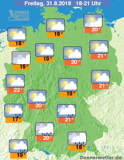Am Abend bleibt es im Norden und in der Mitte teils freundlich, teils bewölkt, aber meist trocken. Die Tempearturen pendeln im Bereich der 20 Grad - Marke.