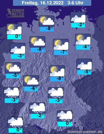 Am Freitag ist es im Süden bedeckt und es fällt zeitweise Schnee, zum Teil auch Schneeregen, dabei ist erhebliche Glätte möglich! Im Osten ist es stark bewölkt, jedoch meist trocken. Im übrigen Land ist es zum Teil heiter, teils einige Wolken durchziehen, dabei bleibt es weitgehend trocken. Die Temperatur steigt auf -3 Grad im Vogtland und bis 2 Grad im Rheinland.
