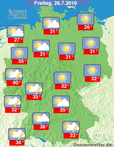 Das Hoch über Skandinavien lenkt mit nordöstlicher Strömung trockene und weniger heiße Luft in den Norden und Nordosten unseres Landes. Der Süden und Westen wird von einer Tiefdruckrinne erfasst, die zum Abend hin teils kräftige Regengüsse und Gewitter auslösen kann. Im Vorfeld dieser Störung gelangt nochmals extrem heiße und zunehmend schwüle Luft in den Westen.