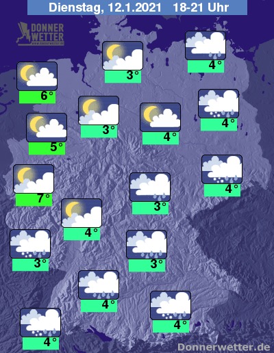 Am Dienstagabend lockern die Wolken im Norden, Westen und der Landesmitte immer weiter auf, Niederschläge sind dann nur noch vereinzelt zu erwarten. Südlich des Mains dominiert weiterhin eine meist geschlossene Wolkendecke, aus der immer wieder Regen, Schneeregen oder Schnee fällt. Der Wind weht vor allem im Norden und Osten weiterhin mäßig bis frisch, an den Küsten auch stürmisch aus Nordwest. Auf den Gipfeln sind auch Sturmböen möglich.