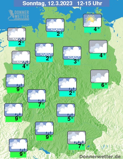 Heute Nachmittag zeigt sich das Wetter verbreitet neblig-trüb oder dicht bewölkt, dabei fällt gebietsweise Regen, Schneeregen und vor allem im Norden Schnee. Die Temperatur liegt bei 2 Grad im Norddeutschen Tiefland und bis 9 Grad am Rhein.