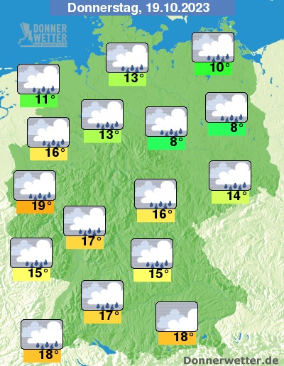 Am Donnerstag bleibt es stark oder dicht bewölkt, dabei fällt zeitweise Regen. Hier und da ist es auch neblig-trüb. Die Temperatur steigt auf nur 8 Grad in der Magdeburger Börde und bis 19 Grad in der Kölner Bucht. An den Küsten weht weiterhin ein zum Teil stürmischer Wind.