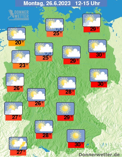 Heute Nachmittag zieht eine schwache Kaltfront mit möglichen Schauern, vereinzelt auch Gewittern von Nordwest nach Südost über die Nordhälfte hinweg. Im Süden bzw. vor und hinter der Kaltfront ist es oft heiter und teilweise auch sonnig, dazu bleibt es trocken. Die Temperatur liegt bei 20 Grad an der Nordsee und etwa 30 Grad in der Lausitz.