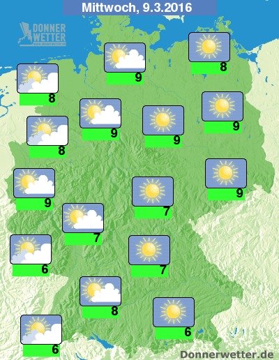 Heute ziehen in den westlichen Landesteilen oft viele, zum Teil auch dichte Wolken durch, weiter nach Osten hin ist es dagegen verbreitet sonnig, zum Teil ziehen hier ein paar lockere Wolken durch, dabei bleibt es landesweit trocken. Die Temperatur steigt auf teils 5 Grad im Alpenvorland und bis 9 Grad in Berlin.