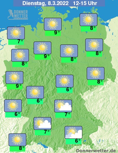 In den Nachmittagsstunden ist der Himmel über weiten Landesteilen heiter oder die Sonne scheint von einem wolkenlosen Himmel. Örtliche Quellbewölkung beschränkt sich auf Teile Süddeutschlands. Es bleibt trocken.