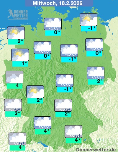 Heute zeigt sich das Wetter meist stark bewölkt, vor allem im Norden können sich zum Teil Auflockerungen zeigend. Vor allem über der Osthälfte, aber auch im Südwesten fällt zeitweise Schnee oder Regen, sonst bleibt es zumeist trocken. Die Höchstwerte erreichen -1 Grad in der Magdeburger Börde und bis 4 Grad am Oberrhein.