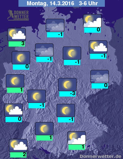 In der folgenden Nacht ist es am Alpenrand teils stark bewölkt, jedoch trocken, im Norden ziehen auch zunehmend einige Wolken auf, dazwischen zeigen sich jedoch häufig auch die Sterne und zudem bleibt es trocken. In den übrigen Landesteilen ist es verbreitet sternenklar und es ziehen höchsten mal ein paar Wolken durch, dazu bleibt es trocken. Die Temperatur sinkt auf 3 Grad in Ostfriesland und bis -3 Grad im Vogtland.