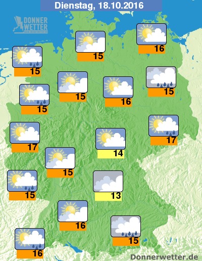 Am Dienstag ist es vor allem vormittags oft locker bis aufgelockert bewölkt und dazu auch meist trocken, nachmittags ziehen mehr Wolken durch, dazu bilden sich mögliche Schauer, zum Teil sogar kurze Gewitter. Es werden 13 bis 17 Grad erreicht.