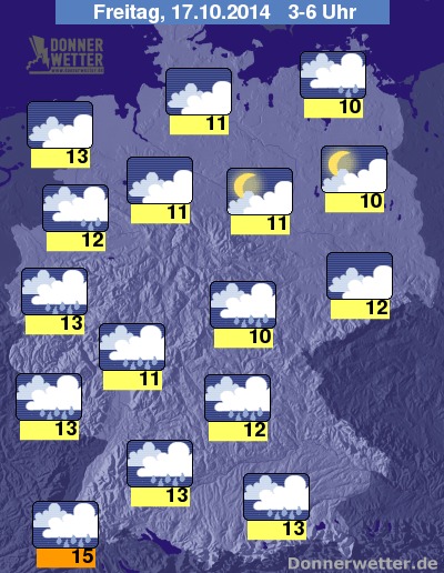 In der kommenden Nacht breiten sich von Südwesten her dichte Wolken, mit zum Teil kräftigem Regen aus, sie erreichen bis zum Morgen etwa eine Linie von Ostfriesland über das südliche Niedersachsen bis nach Sachsen. Auch in den anderen Landesteilen ist es meist stark bewölkt, dabei fällt vor allem entlang der Küstenlinie gelegentlich Regen, sonst bleibt es weitgehend trocken. Die Temperatur sinkt auf teils milde 15 Grad in Freiburg und etwa 10 Grad entlang der Elbe.