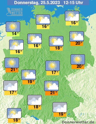 Heute Nachmittag scheint verbreitet die Sonne bei oft locker bewölktem oder zum Teil auch wolkenlosen Himmel. Deutlich bewölkter ist es jedoch im Südwesten sowie südlich des Mains, dazu bleibt es hier weitgehend, sonst komplett trocken. Die Temperatur liegt bei 14 Grad an der Nordsee und etwa 21 Grad im Rheinland.