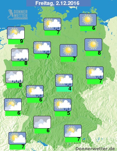 Die Sonne zeigt sich hingegen vor allem im Nordosten und zeitweise auch im Süden. Dank etwas milderer Luftmassen liegen die Höchstwerte am Tag zwischen 4 Grad im Thüringer Bergland und 9 Grad an der Nordsee.