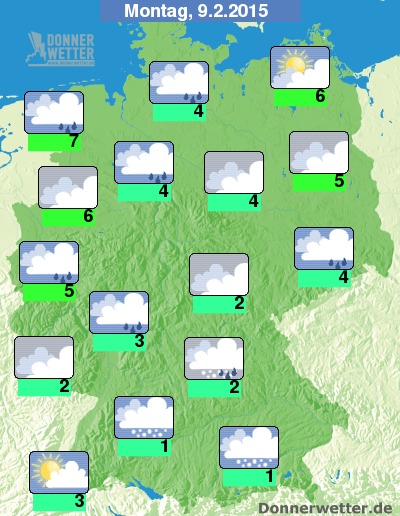 Heute bleibt die Wolkendecke fast landesweit verschlossen, die besten Chancen auf zumindest etwas Sonnenschein bieten sich noch an der Ostsee, sowie am Oberrhein. Dazu fällt in der Nordhälfte Deutschland gelegentlich Regen oder Sprühregen, im Süden fallen die Niederschläge überwiegend als Schnee, dazu besteht Glättegefahr. Im Nordosten bleibt es hingegen verbreitet auch trocken. Die Höchstwerte erreichen 1 Grad in Oberschwaben und bis 7 Grad in Ostfriesland. Im Osten und Südosten weht anfangs noch ein teils starker und in Böen auch stürmischer Wind.