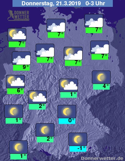 In der ersten Nachthälfte bleibt die Wolkendecke über dem Norden zunächst noch häufig geschlossen, im Süden funkeln häufig die Sterne. Im Nachtverlauf bestimmen dann zumeist lockere Wolkenfelder das Himmelsbild über der Republik. Es bleibt trocken.