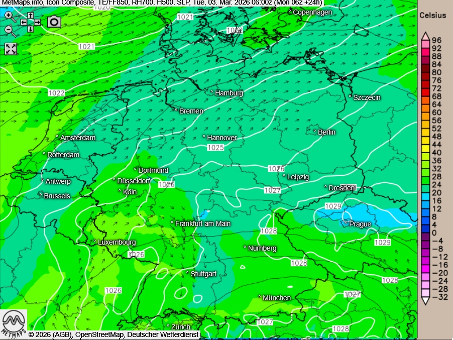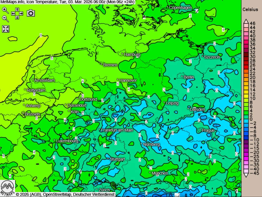 Die Strömungs- und Temperaturkarte sowie die Wetterkarte für Dienstagfrüh (06:00 Uhr) nach ICON: