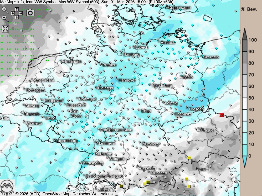 Die Wetter- und Temperaturkarte für Sonntagnachmittag (15:00 Uhr) nach ICON: