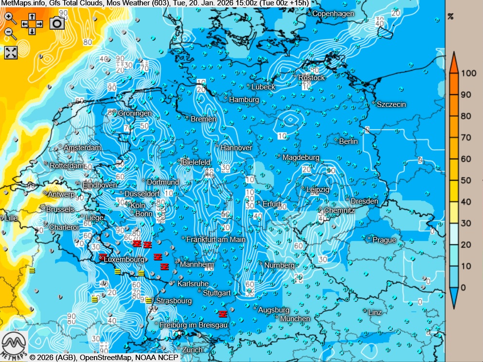 Die Gesamtbewölkung / Wetterkarte sowie die Lufttemperaturen am Dienstagnachmittag (15:00 Uhr) nach GFS:
