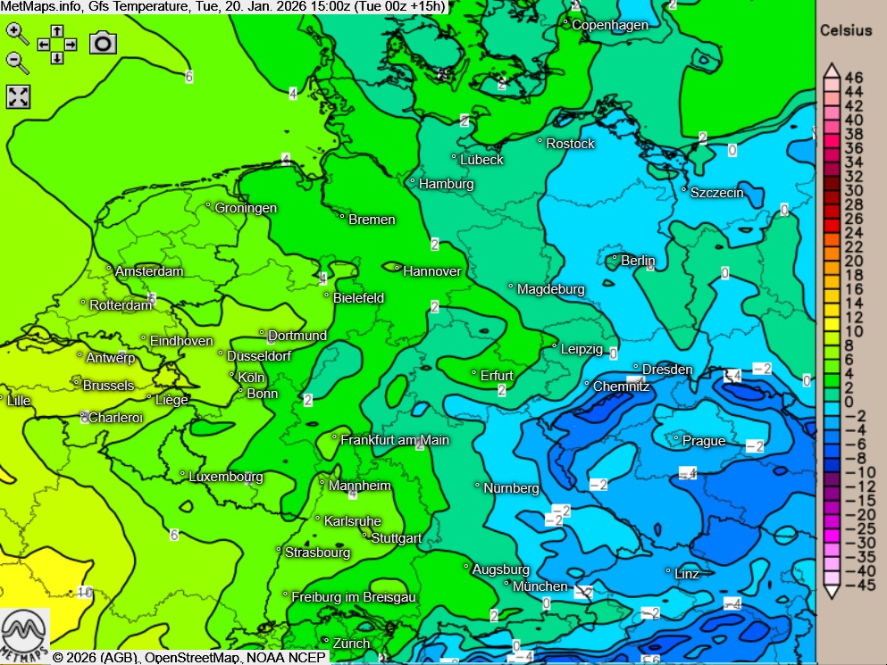 Die Temperaturen erreichen im äußersten Nordosten Höchstwerte um 0 Grad, im Rheinland um 6 Grad.
