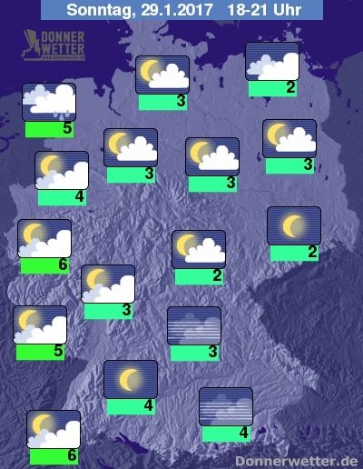 Heute Abend ziehen über den Norden oft aufgelockerte, teils aber auch dichte Wolken hinweg, dabei fällt hier und da auch etwas Regen. Über dem Süden und Sachsen ist der Himmel größtenteils sternenklar. Im übrigen Bundesgebiet herrscht meist wechselnde Bewölkung, dabei bleibt es trocken. Die Werte liegen zwischen 2 und 6 Grad.