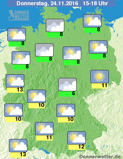 Auch am Nachmittag und frühen Abend zeigt sich vielerorts noch die Sonne. Lediglich zwischen Harz und Nordsee sind auch einige dichtere Wolken unterwegs. Mit Höchstwerten zwischen 8 und 10 Grad - am Rhein sind bis 13 Grad möglich - bleibt es angenehm mild.