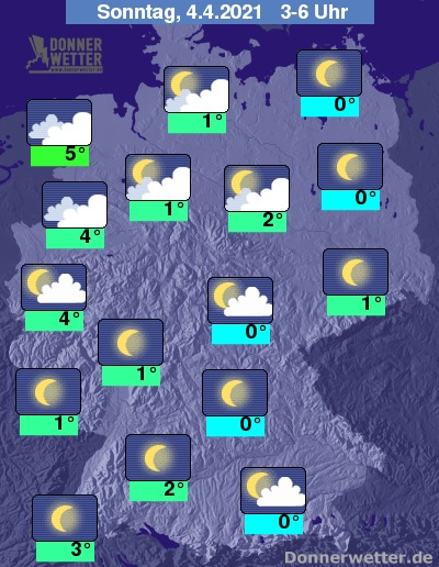 In der kommenden Nacht lockert und klart der Himmel vielerorts auf. Mehr Wolken halten sich vor allem vom Niederrhein bis zur Nordsee, über Thüringen und dem Südosten Bayerns, aber auch hier bleibt es trocken. Die Temperatur sinkt auf 5 Grad an der Ems und bis 0 Grad an der Oder.