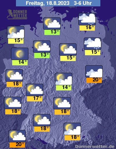 In der folgenden Nacht bilden sich anfangs vor allem über Sachsen und Bayern noch gebietsweise Schauer und mögliche Gewitter, sonst ist es schon oft locker bis aufgelockert, teils aber auch stark bewölkt, aber meist trocken. Im Nachtverlauf lockert es auch im Süden und Osten mehr und mehr auf. Vor allem im Westen ist es auch teils sternenklar. Die Temperatur sinkt auf 20 Grad in Freiburg und 13 Grad in Hamburg.