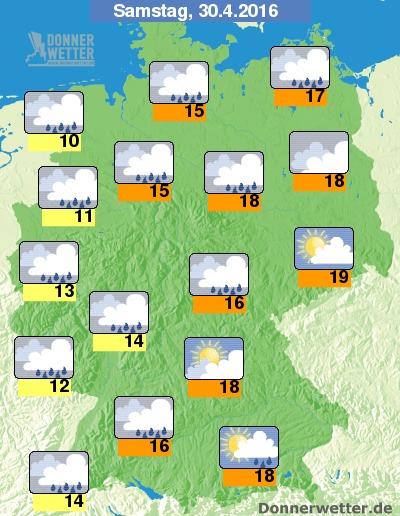 Am Samstag ist es im Südosten und anfangs auch im Osten oft heiter bis sonnig und dazu trocken, im großen Rest der Republik ist es dagegen verbreitet schon stark bewölkt, dabei fällt zunächst vom Rheinland bis nach Schleswig-Holstein zeitweise Regen, sonst ist es noch meist trocken. Am Nachmittag bilden sich dann verbreitet Schauer und vereinzelt auch Gewitter, im Osten und Südosten bleibt es hingegen meist trocken. Die Temperatur steigt auf teils nur 10 Grad im nördlichen Emsland und bis 19 Grad in der Lausitz.