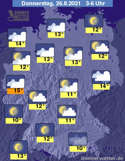 In der folgenden Nacht ist es in einem breiten Streifen von Niedersachsen und NRW bis nach Sachsen meist stark, teils aufgelockert bewölkt, dazu können sich über Sachsen einzelne Schauer bilden, sonst sind nur selten Schauer möglich. Über dem übrigen Land ist der Himmel hingegen meist locker bewölkt oder sternenklar, dazu bleibt es trocken. Die Temperatur sinkt auf 15 Grad in Köln und bis 10 Grad in München.
