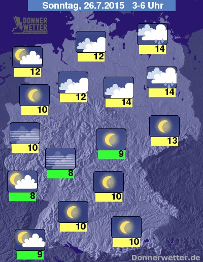 Am Sonntag ist es zunächst meist heiter oder sonnig, gebietsweise ziehen auch einige Wolken durch, dabei bleibt es aber trocken. Gegen Abend werden die Wolken von Westen her zahlreicher und auch dichter, dabei kann es im Westen und Südwesten des Landes nachfolgend auch regnen, sonst bleibt es aber weitgehend trocken. Die Temperatur steigt auf 19 Grad an der Nordsee und bis 25 Grad am Bodensee.